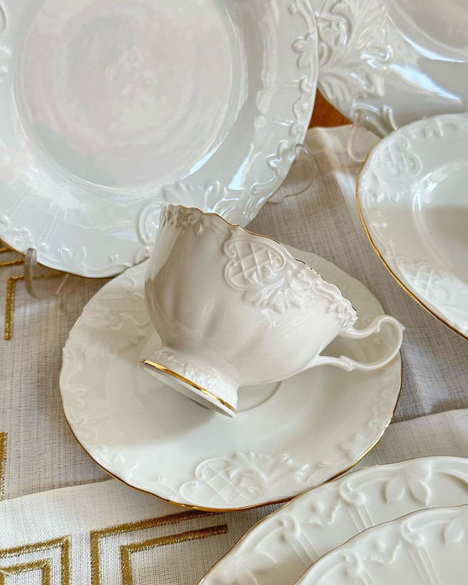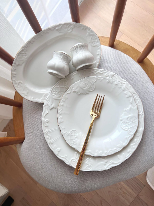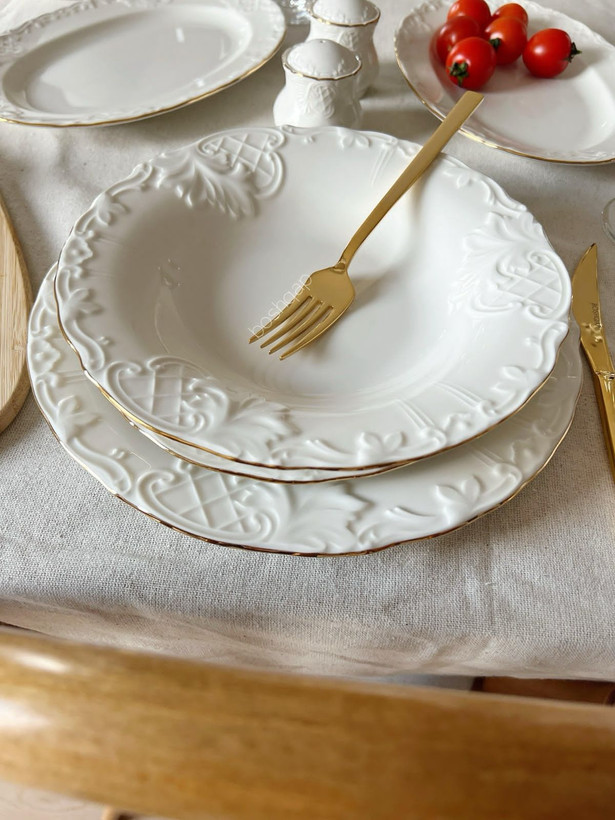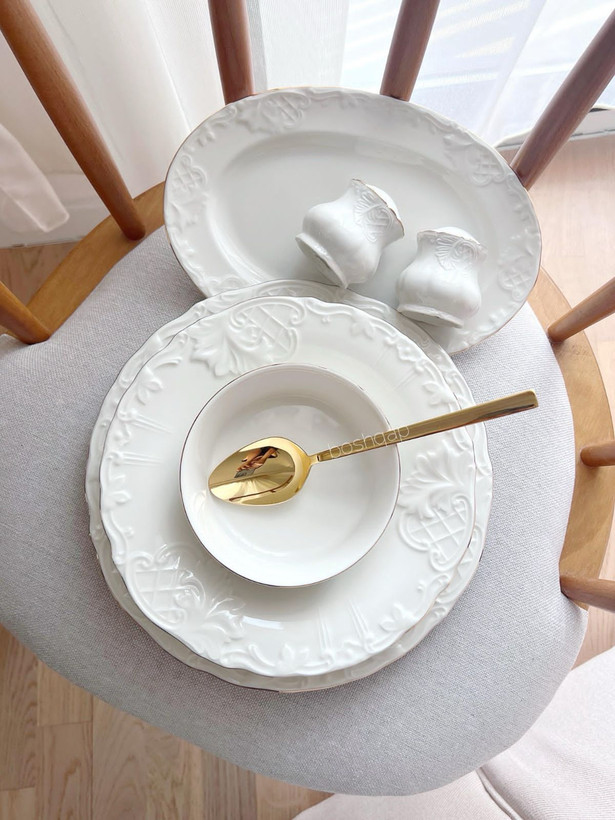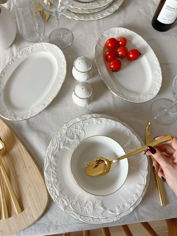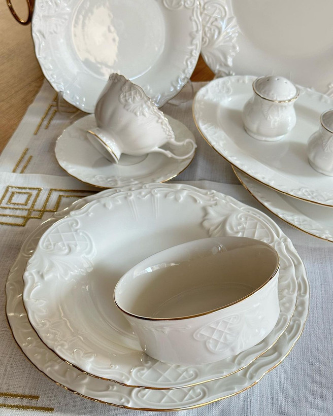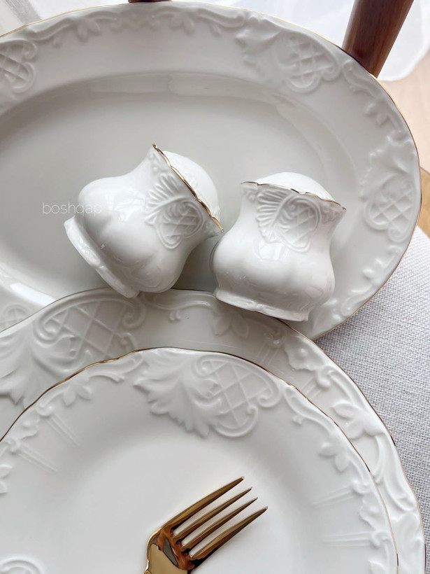 سرویس شامل: ۶ عدد پلو خوری/۶ عدد پیش دستی/۶ عدد خورشت خوری/۶ عدد پیاله/۲ عدد نمکدون و فلفل/ ۲ عدد دیس