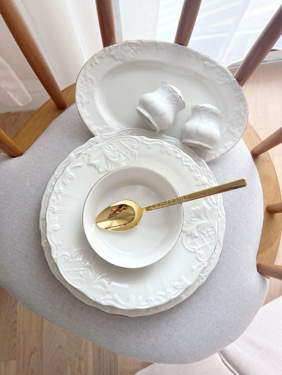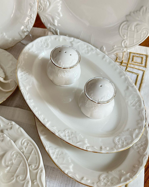 ۶ عدد پلو خوری/۶ عدد پیش دستی/۶ عدد خورشت خوری/۶ عدد پیاله/۲ عدد نمکدون و فلفل/ ۲ عدد دیس