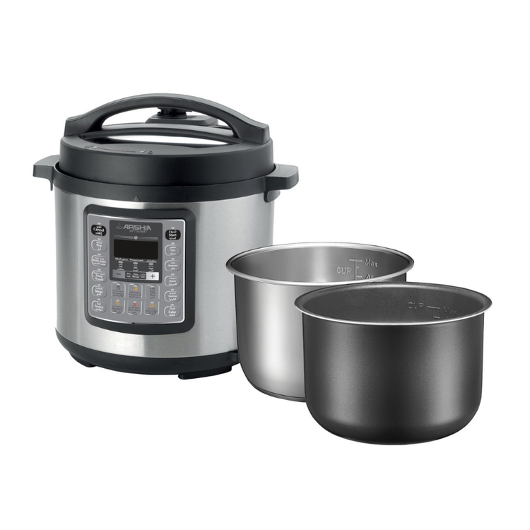 زودپز دیجیتال Arshia مدل EP118-2597 ترکیبی از سرعت، ایمنی و دقت است که تجربهای نوین از آشپزی سریع و سالم را برای شما به ارمغان میآورد. این دستگاه با داشتن دو قابلمه (یکی استیل و دیگری با روکش نچسب)، قابلیت پخت انواع غذاها از برنج و خورشت گرفته تا کیک و سوپ را دارد
