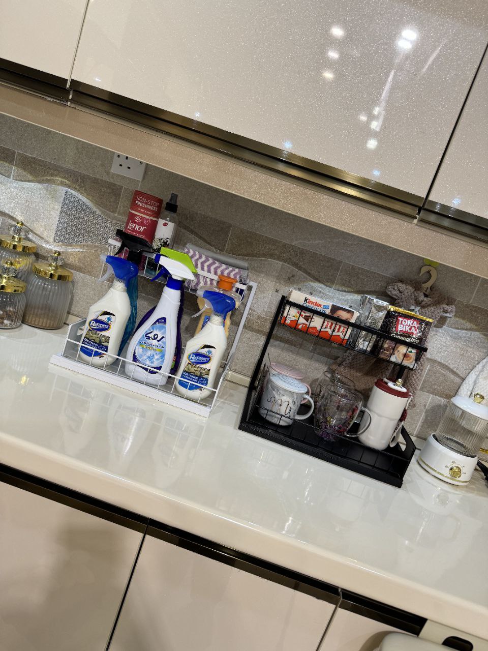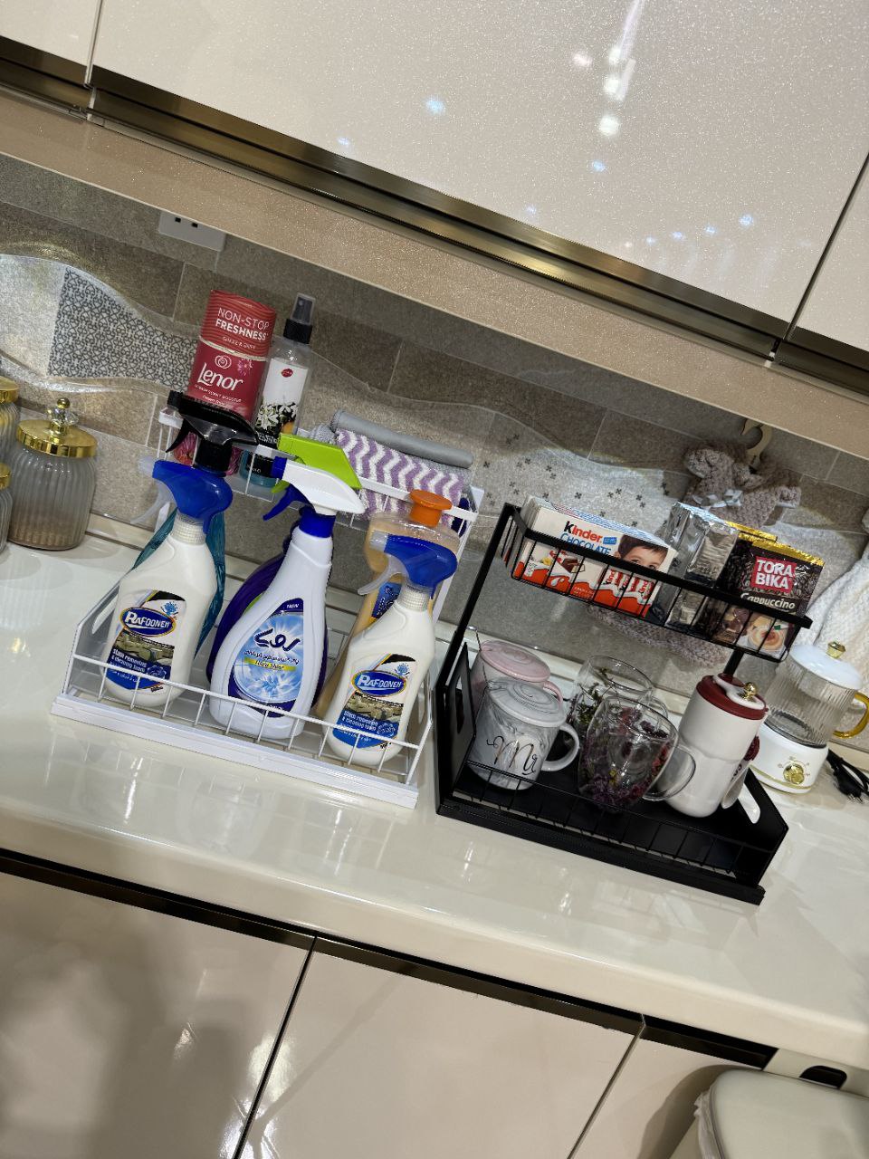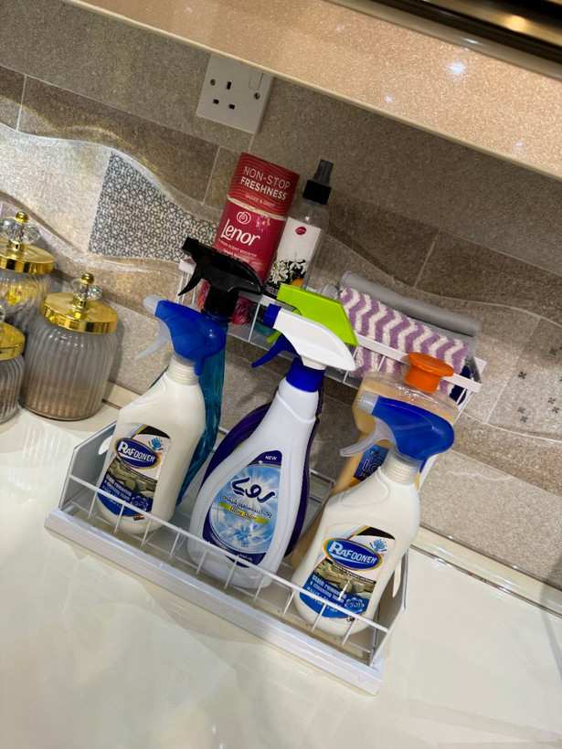 این طرح در زیر کابینت های سینک به خوبی کار می کند، زیرا قفسه بالایی را می توان به راحتی در سمت چپ یا راست نصب کرد و به شما انعطاف پذیری برای کار در اطراف لوله کشی و سازماندهی کارآمدتر می دهد.