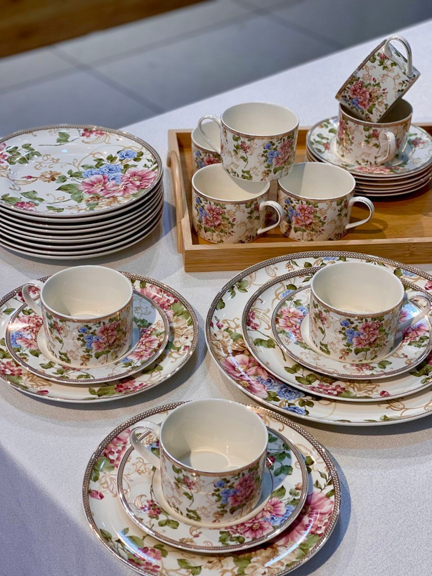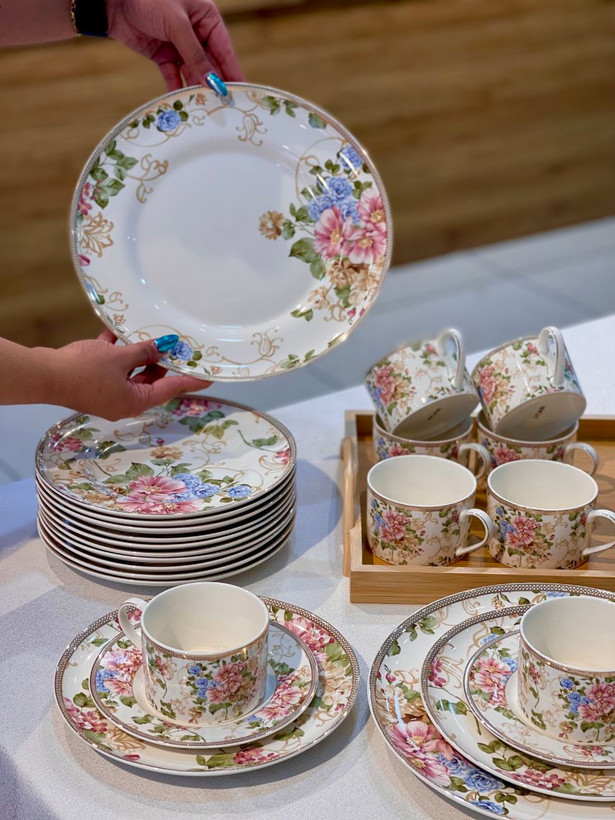 اقلام شامل: ۶ عدد بشقاب سایز ۲۱سانتی متر/ ۶عدد نعلبکی(قابل استفاده برای کیک)سایز ۱۶/ ۶ عدد فنجان چای و نسکافه/ ۱عدد بشقاب سرو