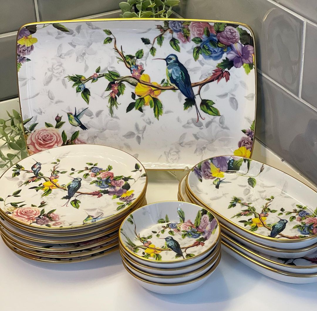 سرویس شامل: ۶عدد پیش دستی ۱۹ سانتی/۴ عدد پیاله قطر ۱۲ سانتی/۲عدد دیس کوچک ۲۱ سانتی/۲ عدد دیس بزرگ ۲۶ سانتی/یک عدد دیس بزرگ ۳۲*۲۰ سانتی